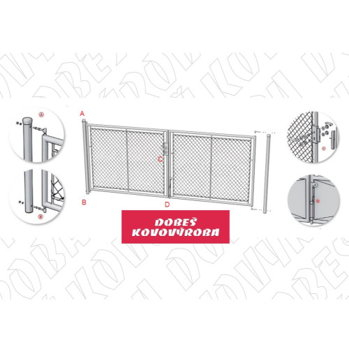 Konstrukce brány je vyrobena z pozinkovaných trubek. Zavírání na kliku se zámkem pro vložku FAB. Výplet poplastovaným pletivem.