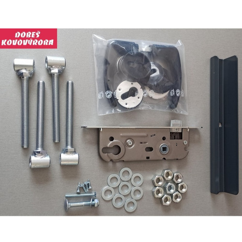 Součástí brány jsou 2 kusy pantových sloupků, 4 kusy stavitelných pantů, zámek, klika a dorazový díl se šroubem. Dorazový díl je otočný,
