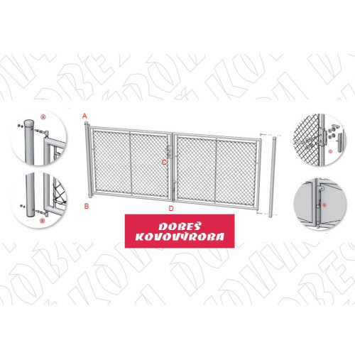 Konstrukce brány je vyrobena z pozinkovaných trubek. Zavírání na kliku se zámkem pro vložku FAB. Výplet poplastovaným pletivem.