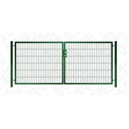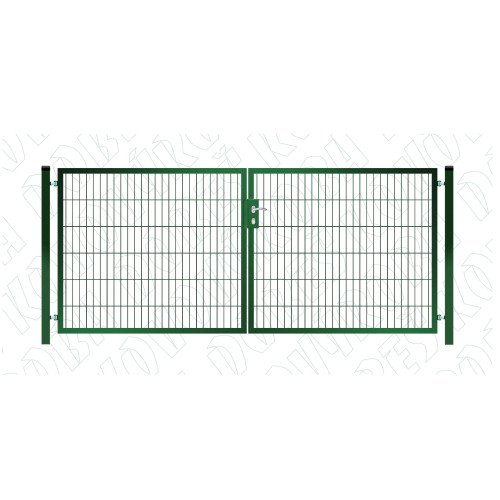 Jeklová dvoukřídlá brána šíře 3600 mm s výplní vevařeným panelem 2D v zelené barvě. Možnost výběru jiné barvy dle stupnice RAL za příplatek 10 – 15 % k základní ceně. Foto ilustrační.