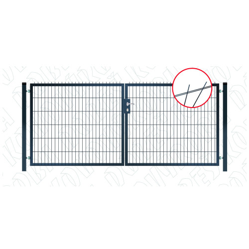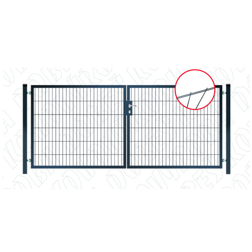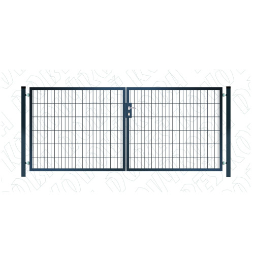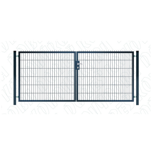 Jeklová brána dvoukřídlá šíře 3000 mm s výplní vevařeným panelem 2D v antracitové barvě. Možnost výběru jiné barvy dle stupnice RAL za příplatek 10 – 15 % k základní ceně. Foto ilustrační.