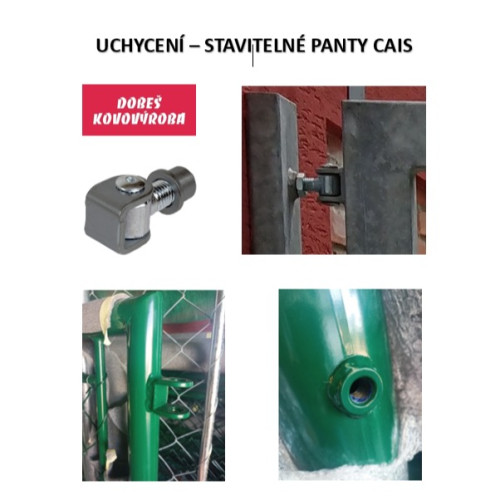 Součástí dodávky jsou: 1 kus dorazového sloupku jekl 60/60/2 a 1 kus pantového sloupku jekl 60/60/3 – pozinkovaný profil DX51D. Stavitelné panty CAIS 2 kusy (viz foto), zámek pro vložku FAB a otočný dorazový díl se šroubem, díky němuž lze branku otvírat k sobě i od sebe.