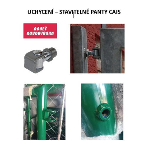 Součástí dodávky jsou: 1 kus dorazového sloupku jekl 60/60/2 a 1 kus pantového sloupku jekl 60/60/3 – pozinkovaný profil DX51D. Stavitelné panty CAIS 2 kusy (viz foto), zámek pro vložku FAB a otočný dorazový díl se šroubem, díky němuž lze branku otvírat k sobě i od sebe.