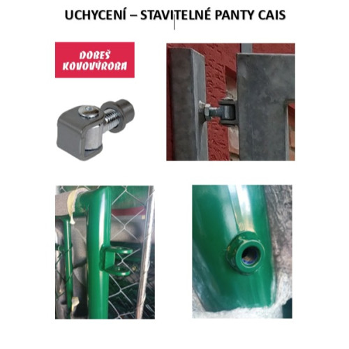 Součástí dodávky jsou: 2 kusy sloupků jekl 80/80/2 (pantový a dorazový) – černý profil. Stavitelné panty CAIS 2 kusy (viz foto), zámek pro vložku FAB a otočný dorazový díl se šroubem, díky čemuž lze branku otvírat k sobě i od sebe.
