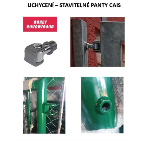 Součástí dodávky jsou: 2 kusy sloupků jekl 80/80/3 (pantový a dorazový) – černý profil. Stavitelné panty CAIS 2 kusy (viz foto), zámek pro vložku FAB a otočný dorazový díl se šroubem, díky čemuž lze branku otvírat k sobě i od sebe.