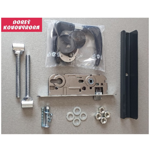 Součástí balíčku je černá klika, ,zámek, doraz, 2 kusy pantů délka 100 mm.