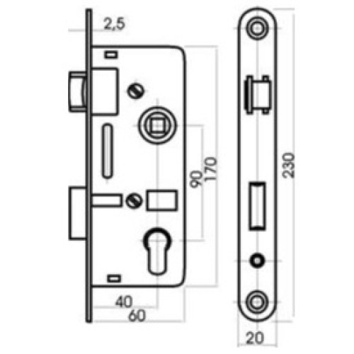 DORNMASS, též označení BACKSET (vzdálenost čela a středu otvoru pro klíč) je 40 mm. Šířka čela: 20 mm. Povrchová úprava: zinek (bílý).