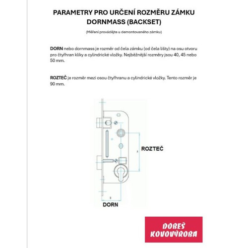 ROZTEČ (vzdálenost mezi otvorem pro kličku a otvorem pro vložku) je 90 mm, hloubka pro zadlabání je 63 mm.