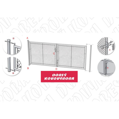 Konstrukce brány je vyrobena z pozinkovaných trubek. Zavírání na kliku se zámkem pro vložku FAB. Výplet poplastovaným pletivem.