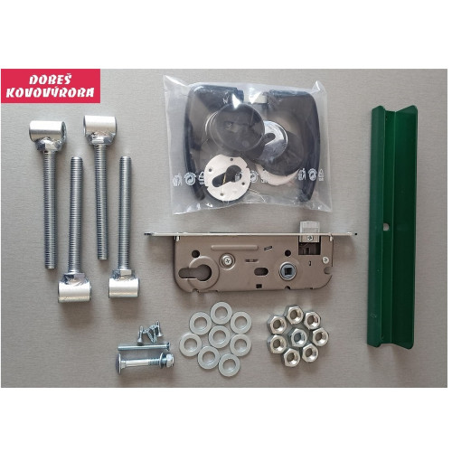 Součástí brány jsou 2 kusy pantových sloupků, 4 kusy stavitelných pantů, zámek, klika a dorazový díl se šroubem. Dorazový díl je otočný,