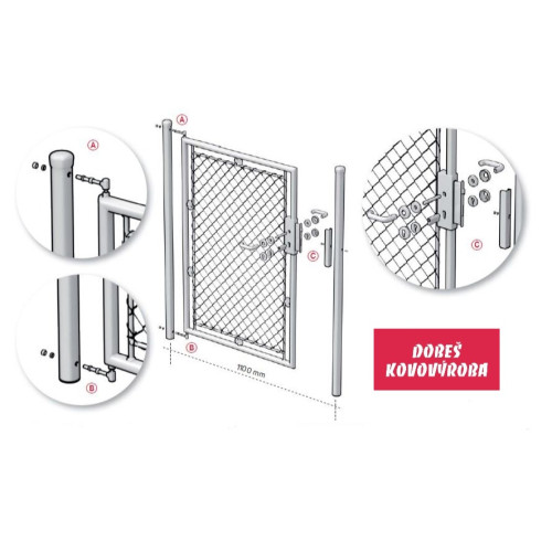 Součástí branky je 1 pantový a 1 dorazový sloupek ø 60mm, 2 kusy stavitelných pantů, zámek, klika a dorazový díl se šroubem. Dorazový díl je otočný, branku lze tedy použít jako pravou i levou.